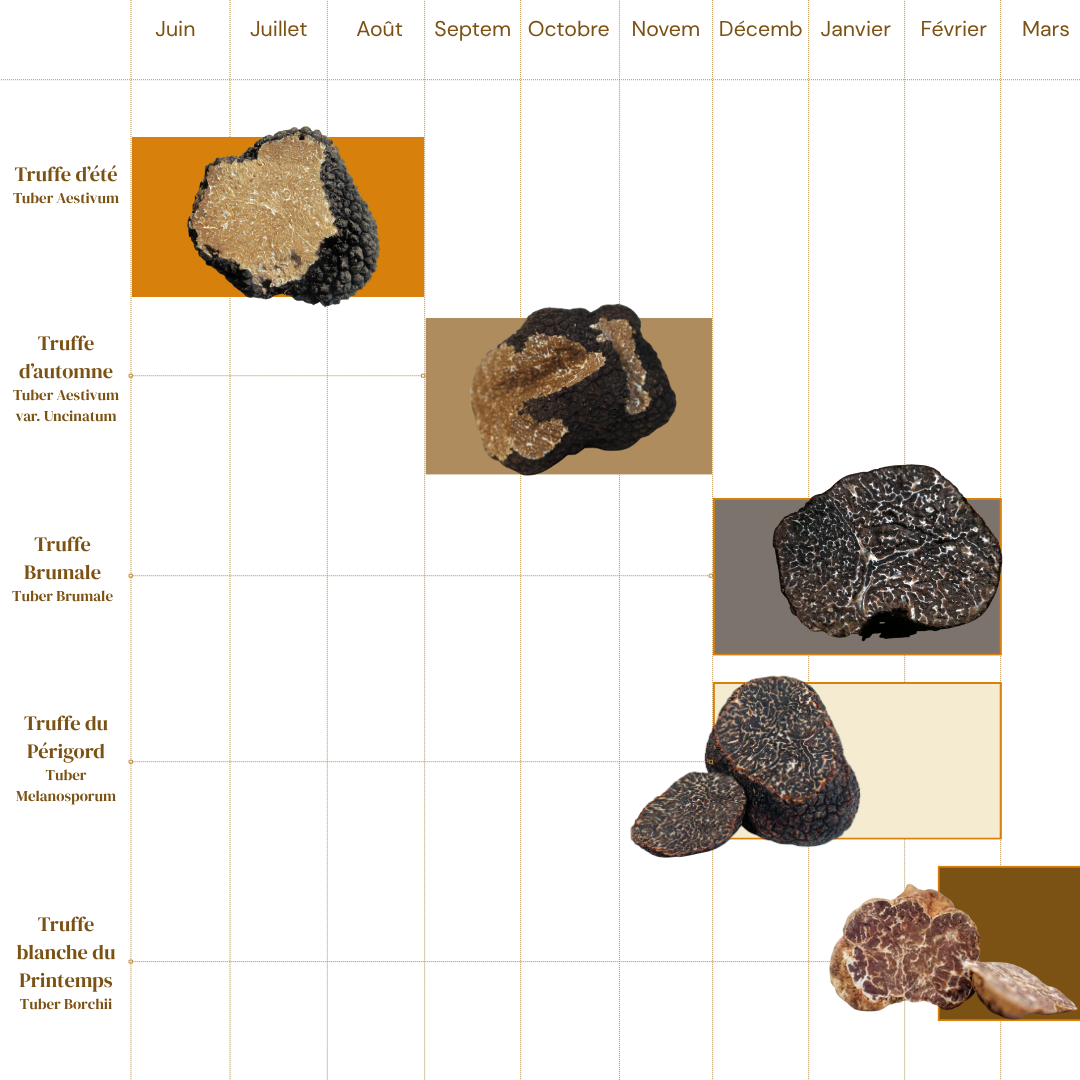 Les truffes fraîches ne sont disponibles que pendant leur saison naturelle, propre à chaque espèce.
